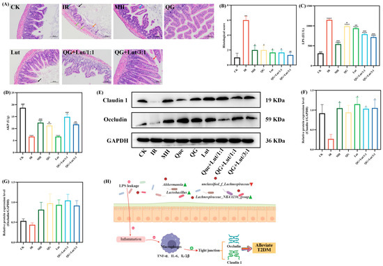 Accumulating evidence suggests that T2DM is a chronic inflammatory disease closely linked to impaired intestinal homeostasis. In addition to the gut microbiota, the intestinal barrier plays a crucial role in maintaining intestinal homeostasis. Histopathological examination of ileal tissues revealed that the CK group had short intestinal villi composed of a single layer of columnar epithelium and goblet cells, abundant and densely arranged intestinal glands in the lamina propria, and a structurally clear myenteric layer with regularly arranged myoblasts (Figure 3A). The intestinal glands in the lamina propria were abundant, densely arranged, and short tubular, and there were few cup cells. The myenteric layer was clear in structure, and the myoblasts were arranged in a regular way, and no other obvious abnormalities were observed. In contrast to the CK group, the IR group showed multiple intestinal villi with apical autolysis and occasional vascular congestion, along with uneven thickness of the muscularis propria. Following intervention with quercetagetin and lutein, all treatment groups exhibited alleviated ileal lesions. Consistent with these findings, histological scoring yielded similar results (Figure 3B).