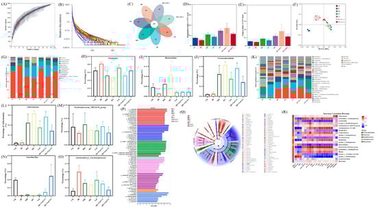 Cecal feces were collected from the cecum of each experimental group of mice and analysis was performed referring to the method described by Qi et al. [16] with minor modifications. Cecal feces were collected from each group, and total DNA was extracted using a QIAamp-DNA Stool Mini Kit (QIAGEN, Beijing, China). The V3–V4 hypervariable region of the bacterial 16S rRNA gene was amplified using the universal primers 338F (5′-ACTCCTACGGGAGGCAGCAG-3′) and 806R (5′-GGACTACHVGGGTWTCTAAT-3′). PCR reactions were performed on an ABI GeneAmp®9700 PCR System (Applied Biosystems, Foster City, CA, USA) under the following conditions: initial denaturation at 95 °C for 3 min, followed by 27 cycles of denaturation at 95 °C for 30 s, annealing at 55 °C for 30 s, and extension at 72 °C for 45 s, with a final extension at 72 °C for 10 min. PCR products were quantified using a QuantiFluorTM-ST Handheld Fluorometer (Promega Corporation, Madison, WI, USA) and sequenced on an Illumina Miseq platform by Majorbio Bio-Pharm Technology Co., Ltd. (Shanghai, China). Raw sequencing reads were quality-filtered and analyzed using the Majorbio Cloud Platform (https://cloud.majorbio.com (accessed on 12 November 2024)). Each operational taxonomic unit (OTU) was categorized and the OTUs were evaluated using Alpha diversity (Simpson index and Bergerparker index), Beta diversity, and categorical composition analysis. LEfSe (version 1.1.x) software was used to analyze the significance of differences between groups. Alpha diversity indices (Simpson, Berger-Parker, Chao1, and Shannon indices) and Beta diversity (weighted/unweighted UniFrac distances) were calculated using QIIME2 (v2020.11). Statistical differences in alpha diversity between groups were assessed using the Kruskal–Wallis test, followed by Dunn’s post hoc test. Permutational multivariate analysis of variance (PERMANOVA) based on Bray–Curtis distances was used to evaluate beta diversity differences. Linear discriminant analysis effect size (LEfSe) was performed to identify differentially abundant taxa across groups (LDA score threshold > 3.0, p < 0.05).