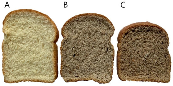 Visual appearance of breads enriched with 5% avocado seed flour (fraction 2). (A) Control bread (CNB); (B) bread with 5% non-extruded flour (NEB, containing NEF2); (C) bread with 5% extruded flour (EB, containing EF2). CNB: control bread; NEB: bread with non-extruded avocado seed flour; EB: bread with extruded avocado seed flour; NEF2: non-extruded avocado seed flour fraction 2; EF2: extruded avocado seed flour fraction 2.