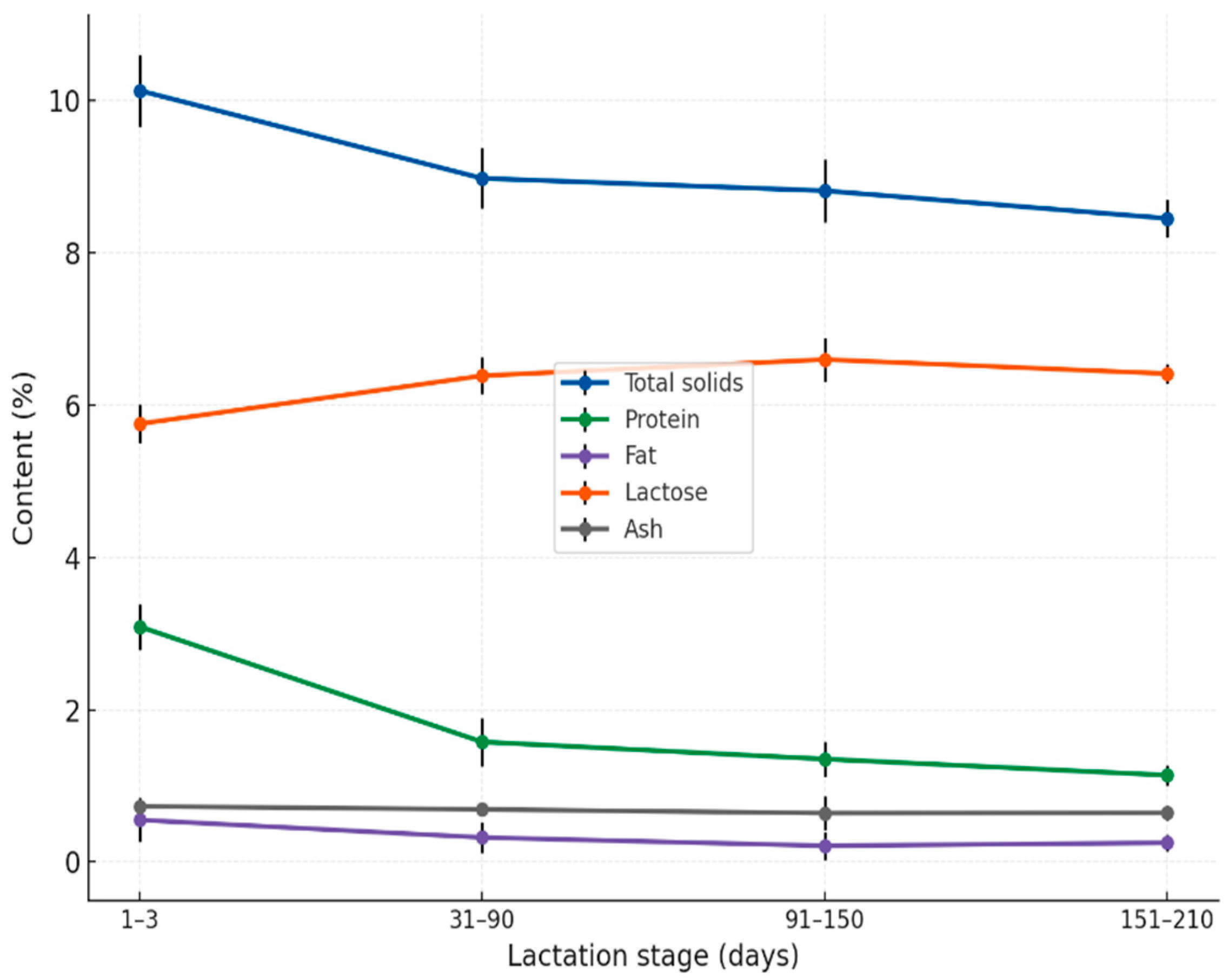 - Zivkov-Balos, M.; Popov, N.; Vidakovic-Knezevic, S.; Savic, S.; Gajdov, V.; Jaksic, S.; Ljubojevic-Pelic, D. Nutritional Quality of Donkey Milk during the Lactation. Bio. Anim. Husb. 2024, 40, 155–168. [Google Scholar] [CrossRef]