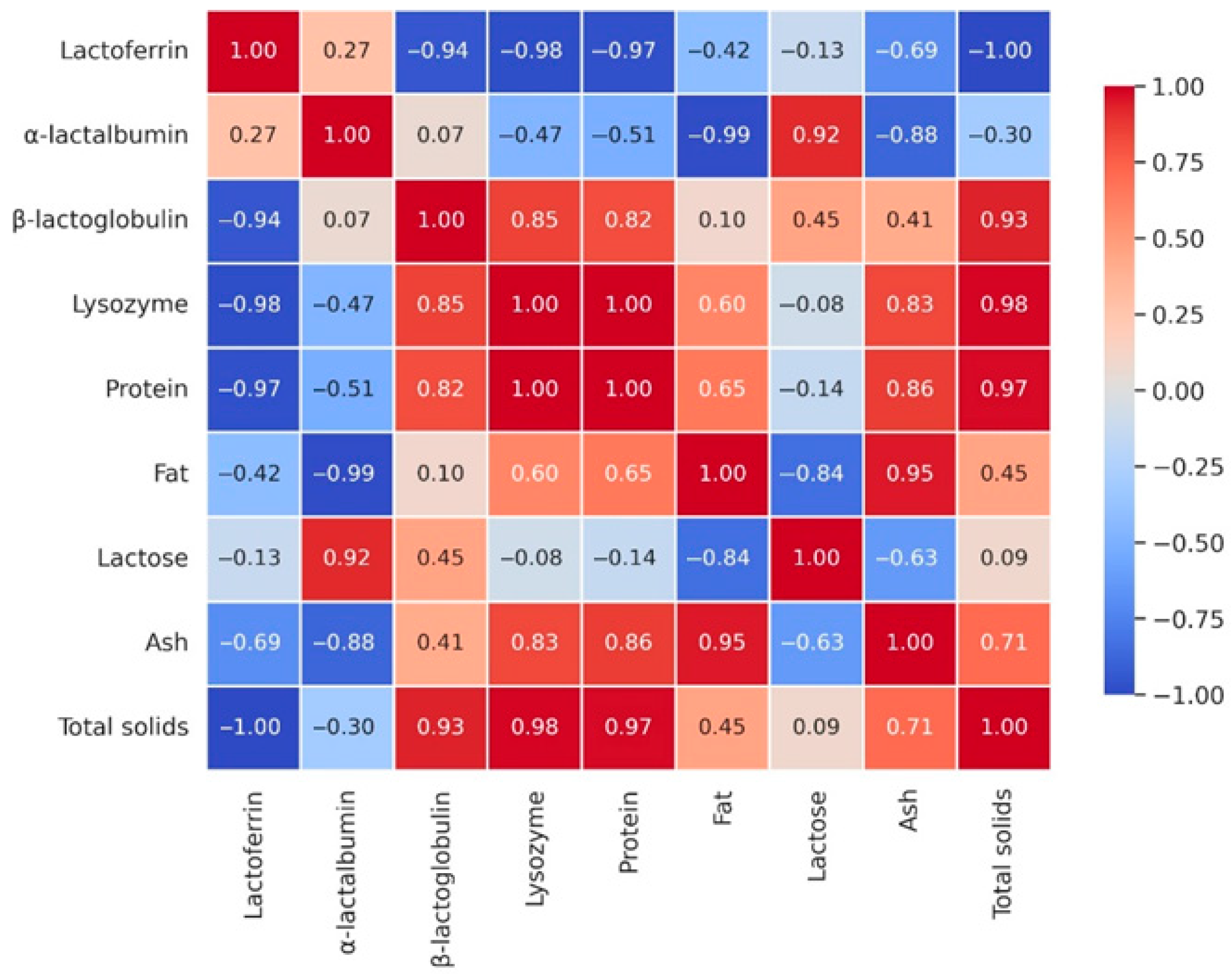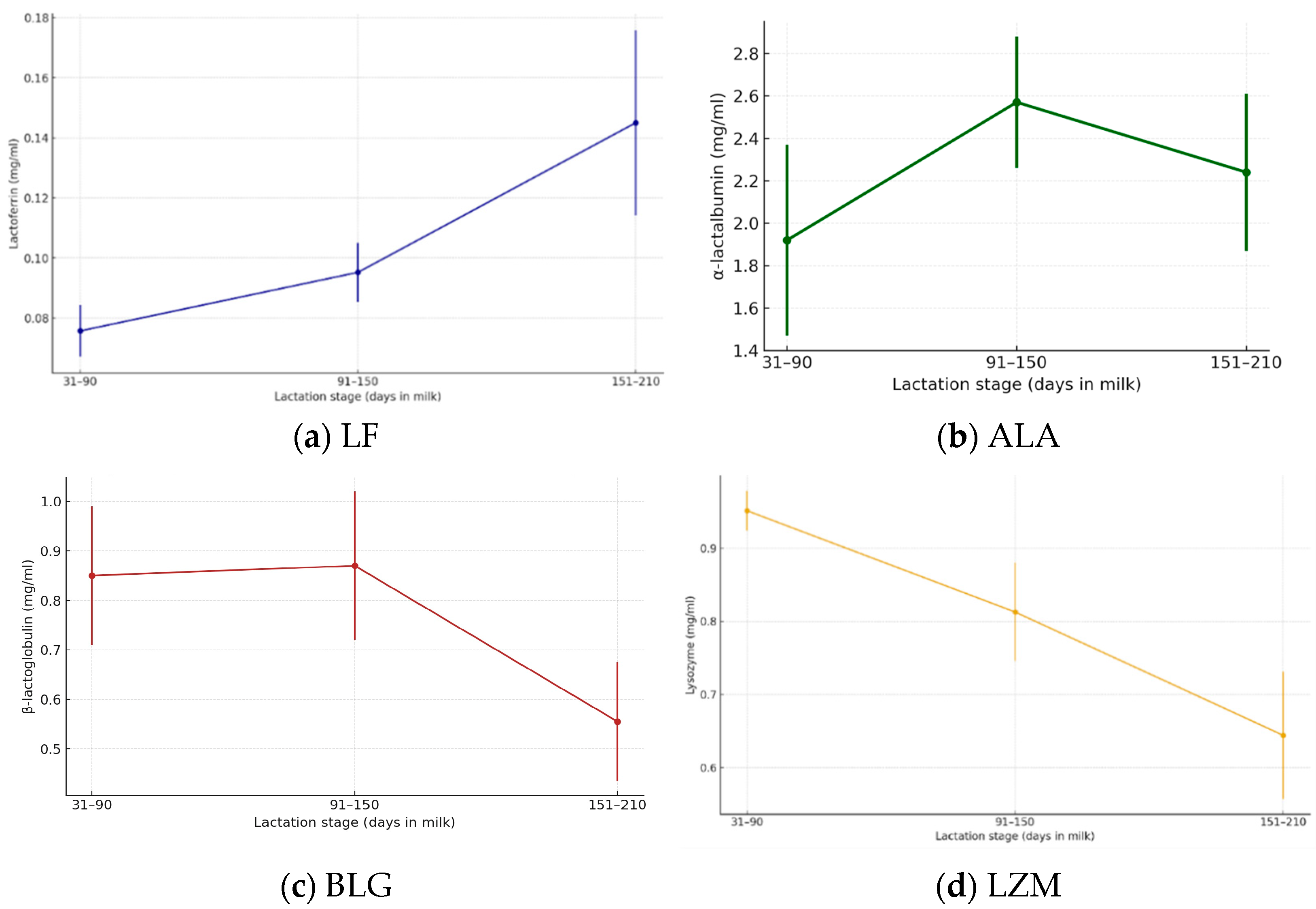 | α-lactalbumin | 1.9169 ± 0.4541 | 1.1495–2.6298 | 2.5856 ± 0.3286 | 1.9768–3.1294 | 2.2512 ± 0.3091 | 1.8203–2.8015 | <0.001 |