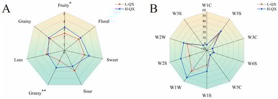 To accurately elucidate the differences in the characteristics of QXB between the two types of alcoholic beverages, this study initially compared their aroma profiles through sensory evaluation experiments. Sensory evaluation revealed significant aroma profile differences between H-QX and L-QX Baijiu samples (Figure 1A), particularly in aroma type, intensity, and balance. H-QX showed higher scores for fruit, floral, sweet, grassy, and grain aromas, while exhibiting lower sour and lees notes than L-QX. Statistically significant differences in fruit and grassy aromas indicated alcohol content-dependent variations in sensory attributes. Furthermore, the E-nose has been demonstrated to effectively detect and analyze volatile compounds in samples, providing supplementary data to support these sensory findings [41]. Electronic nose analysis (Figure 1B) further supported these findings. Sensors W1S, W2S, W1W, and W2W showed higher response values for H-QX, confirming distinct volatile compound profiles. These findings demonstrate that the aroma profiles of both samples exhibit marked differences due to variations in alcoholic strength.
