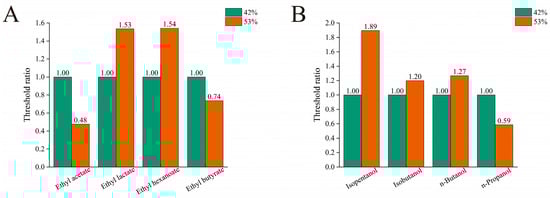 Threshold ratio for esters (A) and alcohols (B) at varying ethanol concentrations (with a threshold of 42% as 1).