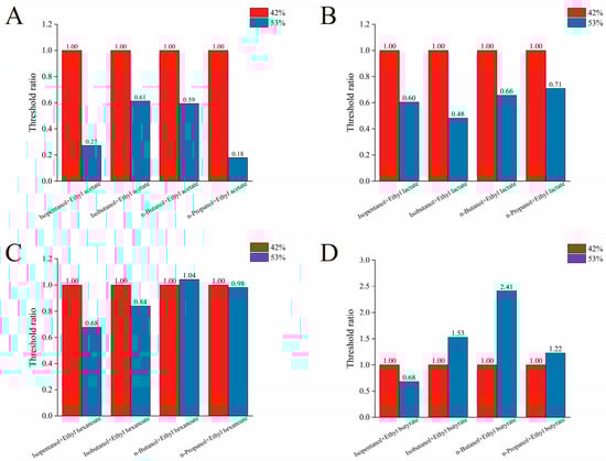 Then, the effect of ethanol concentration on the olfactory thresholds of alcohol–ester binary mixtures was investigated. Sixteen distinct binary alcohol–ester mixtures were prepared at precise concentrations. The thresholds obtained at 53% ethanol aqueous solution were then compared to those measured at 42% ethanol aqueous solution. As shown in Figure 3A, the ratio of the detection threshold in 53% ethanol aqueous solution to that in 42% ethanol aqueous solution for binary mixtures of isopentanol, isobutanol, n-butanol, and n-propanol with ethyl acetate is less than 1. Notably, this ratio falls below 0.5 for mixtures containing isobutanol or n-propanol with ethyl acetate. Figure 3B reveals a similar trend for binary mixtures of these four alcohols with ethyl lactate, where all ratios are less than 1. Notably, the threshold ratio for the isobutanol and ethyl lactate mixture exceeds this trend, falling below 0.5. Conversely, Figure 3C shows that the threshold ratio for the n-butanol and ethyl hexanoate binary mixture is greater than 1, indicating a marginally higher detection threshold at 53% ethanol aqueous solution compared to 42% ethanol aqueous solution. As shown in Figure 3D, the detection threshold ratio for the binary mixture of n-butanol and ethyl butyrate significantly exceeded the OT of 42% ethanol aqueous solution, reaching 2.41-fold that value. The threshold ratios for binary mixtures containing isobutanol and n-propanol with ethyl butyrate at the 53% ethanol aqueous solution were also higher than 42%, reaching 1.53 and 1.22 folds, respectively. All three of these binary mixtures exhibited threshold ratios greater than 1. Based on the above analysis, the four binary mixtures with threshold ratios exceeding 1 included n-butanol with ethyl hexanoate, isobutanol with n-butanol, and n-propanol with ethyl butyrate. Conversely, the ratio of three binary mixtures (isobutanol with ethyl acetate, n-propanol with ethyl acetate, and isobutanol with ethyl lactate) was below 0.5. Additionally, the threshold ratios of nine binary mixtures were between 0.5 and 1.