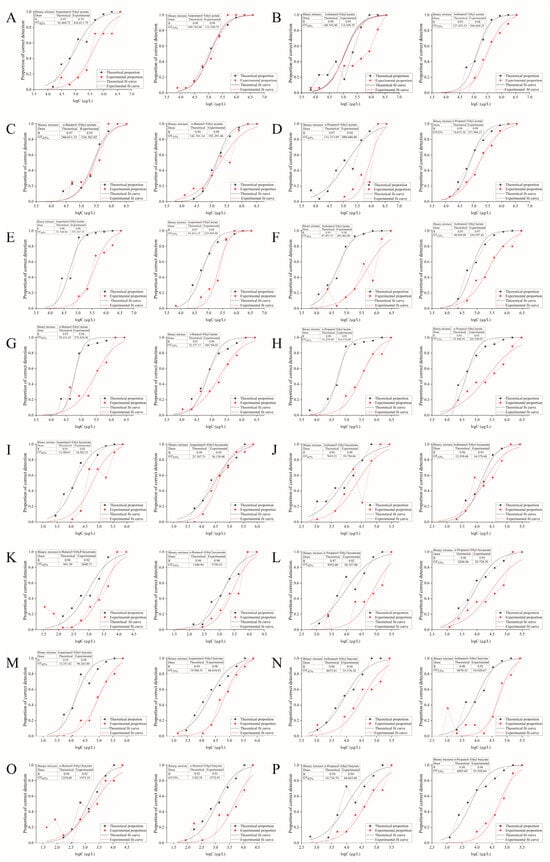 The theoretical detection probability of mixtures, P(AB), was calculated using Feller’s summation equation [37], as shown in Equation (3). P(A) and P(B) represent the measured corrected detection probabilities of components A and B at their respective concentrations. A theoretical log (concentration)-P curve was generated and fitted to the S-curve Equation (2) to obtain the theoretical S-curve. The theoretical threshold was defined as the concentration at P = 0.5.