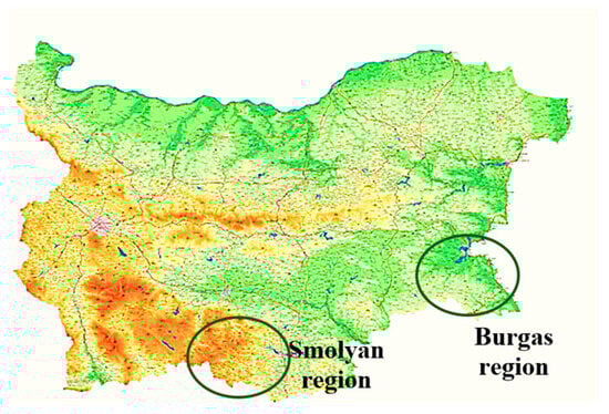 This investigation utilized a total of seventeen honey samples from Bulgaria harvested in 2022. The sample set comprised ten oak honeydew honey samples, sourced from the following distinct geographical locations within the Burgas region: Ahtopol (two samples), Sinemorets (three samples), Strandzha Mountain (one sample), Malko Tarnovo (two samples), and Tsarevo (two samples). Additionally, seven polyfloral honey samples with a confirmed admixture of coniferous honeydew honey were included, collected from the Smolyan region (specifically, the Pamporovo resort—one sample, the Smolyan Lakes area—two samples, Momchilovtsi village—one sample, and Zlatograd—three samples). Sample regions are presented in Figure 1. All samples were stored in glass jars for 4 weeks in the dark at 18 °C prior to analysis.