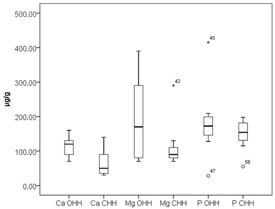 Box plot diagram of contents of Ca, Mg, and P in Bulgarian OHH (oak honeydew honey) and CHH (coniferous honeydew honey) expressed as µg/g. Minimal, maximal, and median values are presented. Legend of outliers: CHH 42 (Mg)—Smolyan Lakes 1 (290 µg/g), OHH 45 (P)—Tsarevo 1 (415 µg/g), OHH 47 (P)—Sinemorets 2 (28 µg/g), CHH 58 (P)—Pamporovo resort 1 (55 µg/g).