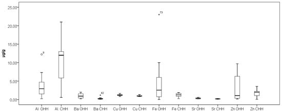 Figure 3 presents the results obtained for elements Na and Mn while Figure 4 presents the results obtained for elements Al, Ba, Cu, Fe, Sr, and Zn in the analyzed OHH and CHH samples. As can be seen from Figure 4, elements Cu and Sr stand out with relatively narrow concentration ranges of their content in OHH and CHH—0.80–1.34 µg/g Cu and 0.090–0.38 µg/g Sr in OHH, and 0.83–1.69 µg/g Cu and 0.18–0.60 µg/g Sr in CHH. Our results are in agreement with the research of Mara et al. [21].