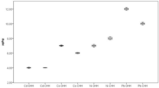 As can be seen from Figure 2, Figure 3 and Figure 4, the outlier samples are occasional and not repeated, except for one sample which stands out with higher contents of Ba and Mg in one sample of CHH. These occasional outlier standings are related to different samples, which means that outlying is specifically for concrete samples and no correlation for element content is observed. As can be seen from Figure 5, Co presents in trace levels in the analyzed honey samples. Its content ranges are 7.0 ± 0.1 µg/kg in OHH and 6.0 ± 0.1 µg/kg in CHH.