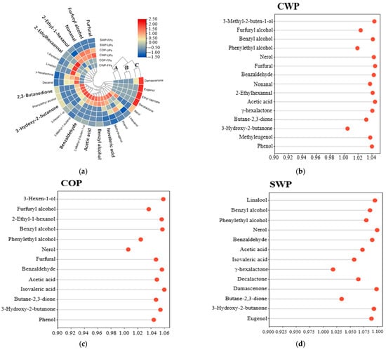 Moreover, the flavor profiles of each fermentation sample were various. Among them, the CWP-FPs showed the highest OAV levels for most compounds (3-methyl-butanol, benzyl alcohol, benzaldehyde and 2,3-butanedione), indicating that this group had the strongest flavor compared to the others. The OAVs of these VOCs in the COP-FPs were lower than those in the CWP-FPs. However, only the OAV of 3-methyl-1-butanol was below 1, which indicated that its aroma was relatively weak and lacked the fruity aroma compared with the CWP fermentation group. For the SWP fermentation group, only the OAV of 2,3-butanedione was greater than 1, indicating that this group only has a distinct buttery aroma, without any notable fruity, floral or sweet scents. Based on the comprehensive analysis results of volatiles composition and odor profiles, Lactobacillus fermentation could promote the formation of positive flavor compounds in peach samples, especially when fermented with both peel and pulp.