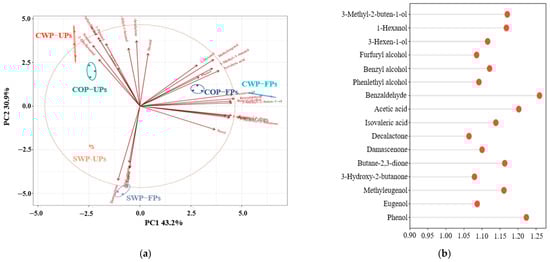 Analysis of the differences in the composition of VOCs among different fermentation groups; (a) PCA analysis of peach samples from different raw material methods; (b) Analysis of differential metabolites in fermented peach samples from different groups.
