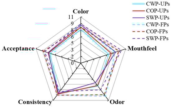 The sensory evaluation of odor, color, mouthfeel, consistency and overall acceptance for each sample is shown in Figure 4. It was found that Lactobacillus fermentation significantly influenced the sensory characteristics of samples, particularly odor and mouthfeel. The odor satisfaction scores of all fermented groups were higher than those of the unfermented groups. The CWP-FPs received the highest odor score, followed by the COP-FPs and SWP-FPs. This indicates that Lactobacillus fermentation with peel and pulp generated more aromatic compounds that were highly appreciated by customers, aligning with the findings from the VOC analysis. However, the presence of peel and pulp was not friendly to mouthfeel. Generally, peach juice without pulp and peel aligns better with consumers’ expectations of traditional juice, as the presence of peel and pulp reduce the refreshing quality of products, especially the peel. The mouthfeel satisfaction of the CWP group before and after fermentation were the lowest, followed by the COP group. The SWP treatment group exhibited drawbacks, such as insufficient flavor and noticeable sedimentation. In contrast, products obtained from CWP and COP fermentation were more homogeneous. Overall, the products from the COP treatment group achieved the highest acceptance after fermentation.