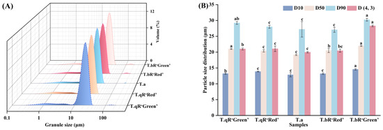 The terms D10, D50, and D90 denote the particle diameters representing the accumulations of 10%, 50%, and 90% of granules, respectively. Furthermore, D(4, 3) signifies the volume-based mean particle diameter of starch granules [20]. The particle size distribution and parameters of starch samples from different water caltrop varieties are shown in Figure 2. The particle size distribution curves exhibited unimodal distributions with a primary peak between 16 and 35 μm, indicating concentrated granule distribution with the typical size range for tuber starches. Notably, a minor peak beyond 100 μm was observed in all five varieties, representing very large particles with minimal proportions, likely attributed to secondary aggregation of starch granules [21]. Among the five varieties, T.bR‘Green’ starch displayed the largest granules, D(4, 3) value reached 28.28 μm, which is higher than that of other varieties (18.34–22.15 μm), consistent with the granule sizes observed via SEM.