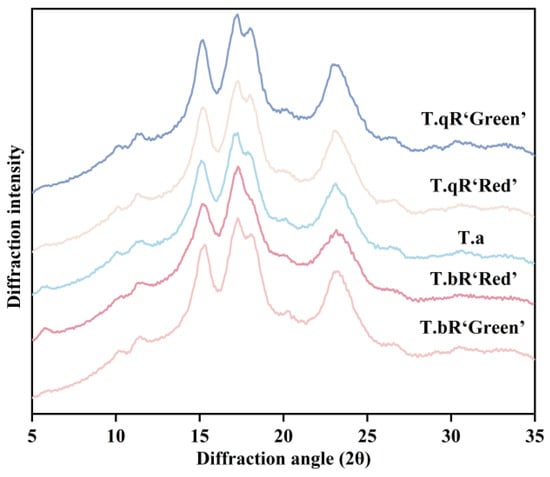 Amylopectin’s chain length distribution is divided into four fractions based on the degree of polymerization (DP) as follows: A-chains (DP = 6–12), B1-chains (DP = 13–24), B2-chains (DP = 25–36), and B3-chains (DP > 36) [35]. A-chains, which are the outermost chains connected to B-chains through α-1,6 glycosidic bonds, are incapable of further branching. Short chains include A- and B1-chains, while long chains encompass B2- and B3-chains, which have a propensity to form double-helical structures [36]. Figure 7 illustrates the amylopectin chain length distributions in starch samples derived from various water caltrop cultivars. The data reveal a consistent pattern across all samples, characterized by two prominent peaks at degrees of DP 13 and 44. The B1 (DP = 13–24) accounted for the highest proportion of amylopectin chain length distributions in all water caltrop starches, which is consistent with findings for pea starch [37] and buckwheat starch [38]. The proportion of short chains (A + B1) in T.a reached 76.22%, which was significantly higher than that in T.qR‘Green’ (71.37%). Notably, the total long chain (B2 + B3) content in T.qR varieties (28.64–28.84%) exceeded that in T.bR varieties (24.85–28.15%). This suggests a potential correlation between the morphological characteristics of water caltrops and the regulatory mechanisms underlying starch biosynthesis. Amylopectin with a chain length of DP 13–24 was more likely to form the crystalline structure of starch. T.a had the lowest relative crystallinity, which may be due to the lower proportion of DP 13–24. However, the content of amylopectin B1 chain was not the only factor affecting the crystallinity. Differences in the size and arrangement of crystals in amylopectin cells and the interactions between crystals may also lead to differences in crystallinity [39].
