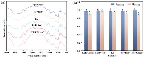 FTIR patterns (A), the R1047/1022 and R995/1022 values (B) of all water caltrop starch samples.