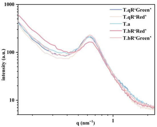 The peak area is positively correlated with the degree of order in the lamellar regions [31]. The order of peak area magnitude was T.bR‘Green’ > T.qR‘Green’ > T.qR‘Red’ > T.a > T.bR‘Red’ (Table 2), indicating that T.bR‘Green’ and T.bR‘Red’ possessed the highest and lowest lamellar order, respectively, consistent with the XRD results. Moreover, the peak intensity is contingent upon the level of ordered semi-crystalline structure and/or the electron density contrast (Δρ) between the crystalline and amorphous lamellae compared to the amorphous background [12]. Significantly divergent peak intensities were observed across various water caltrop starch varieties, suggesting notable distinctions in their semi-crystalline architectures.