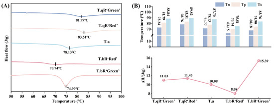 The thermal properties of starches from different water caltrop varieties are shown in Figure 8. The To, Tp, and Tc ranged from 63.15 to 78.76 °C, 70.74–83.51 °C, and 75.51–89.82 °C, respectively, while ΔH varied between 8.10 and 15.39 J/g, respectively. The order of To, Tp, and Tc among the five water caltrop starches was T.qR‘Red’ > T.qR‘Green’ > T.a > T.bR‘Green’ > T.bR‘Red’. Studies have demonstrated that longer amylopectin chains tend to form more stable double-helical structures, leading to higher gelatinization temperatures [40,41]. Consistent with the long-chain amylopectin proportions reported in the fine structure of amylopectin, T.qR‘Red’ had the highest long chains content, which explains why it exhibited the highest gelatinization temperatures (To, Tp, and Tc), directly supporting this mechanistic link between chain structure and thermal properties.