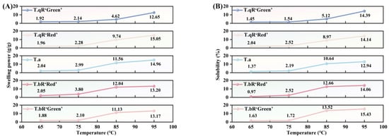 Among the five types of water caltrop starch, T.qR‘Green’ exhibited the lowest swelling power across 65–95 °C, which was consistent with its highest amylose content. Amylose can entangle with the internal segments of amylopectin in the amorphous lamellae of the granules, thereby inhibiting amylose leaching and restricting granule expansion [50]. Notably, a contrasting trend was observed for solubility; at 85 °C and 95 °C, T.bR‘Green’ demonstrated the highest solubility among all varieties. This phenomenon can be attributed to the higher amylose content, which enhances the presence of amorphous regions within starch granules. Consequently, this facilitates the penetration of water molecules and structural disruption [13].