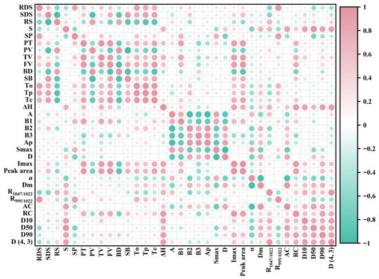 R1047/1022 was positively correlated with RS content (R = 0.69, p < 0.05) but negatively correlated with RDS content (R = −0.65, p < 0.05). This is consistent with the understanding that a higher short-range order restricts enzymatic hydrolysis, thereby slowing digestion [53]. Furthermore, the negative correlations of RDS with D50 (R = −0.57, p < 0.05) and D(4, 3) (R = −0.51, p < 0.05) support the view that larger granules, with a lower specific surface area, may reduce enzyme contact.