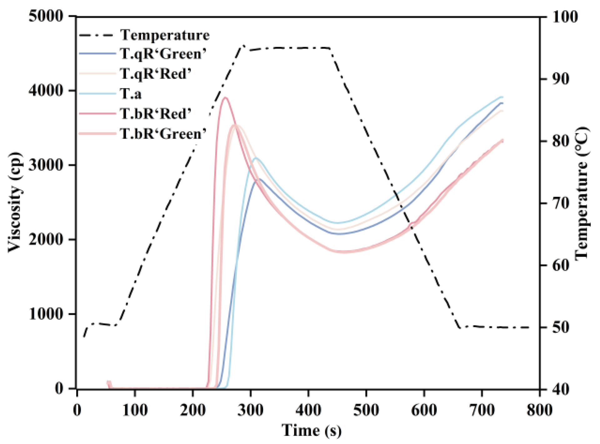 - Xing, B.; Yang, X.; Zou, L.; Liu, J.; Liang, Y.; Li, M.; Zhang, Z.; Wang, N.; Ren, G.; Zhang, L.; et al. Starch Chain-Length Distributions Determine Cooked Foxtail Millet Texture and Starch Physicochemical Properties. Carbohydr. Polym. 2023, 320, 121240. [Google Scholar] [CrossRef] [PubMed]