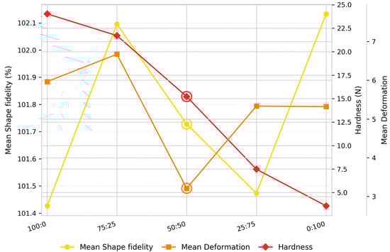 The formulation containing a 50:50 almond-to-yeast protein ratio exhibited the most balanced performance across all evaluated parameters (Figure 2). Its shape fidelity values (length = 103.29%, width = 105.06%, height = 96.83%) were closest to the target value of 100%, with low deformation (<4%) indicating precise layer deposition and high dimensional accuracy. The intermediate hardness (15.22 N), positioned between the almond-only (24.03 N) and yeast-only (3.58 N) samples, suggested an optimal balance between rigidity and flexibility. Although slightly lower in shape stability than the almond-only formulation, its favorable texture, minimal deformation, and well-defined printed layers placed it first overall in terms of print quality and structural performance.