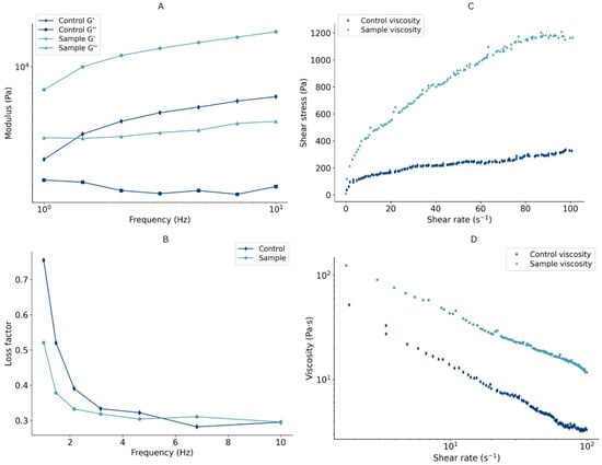 The apparent viscosity, the ratio between the shear stress and shear rate, is directly affected by its composition and plays a crucial role in 3D printing [41]. The most suitable formulation should have a viscosity that is high enough to sustain its structure but low enough to enable extrusion [39]. Flow curves are presented in Figure 3C,D. An increase in shear stress and a decrease in viscosity were observed as the shear rate advanced, indicating that both the control and protein-enriched formulation showed shear-thinning behavior. Hence, these materials show a potential to be printable, as their shear-thinning nature ensures easy flow throughout deposition and optimal mechanical characteristics of the printed object once it leaves the nozzle [42].
