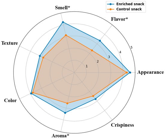 In total, 40 consumers participated in the study, comprising 26 females and 14 males, with ages ranging from 18 to 65 years. All participants received detailed information about the study and signed informed consent forms before the testing began. The 7-point hedonistic sensory evaluation was carried out through an online questionnaire, with further details provided in the Supplementary Materials. During the sensory session, panelists were asked to assess, on a 7-point Likert scale from “Dislike very much” (1) to “Like very much” (7), the sensory attributes (color, appearance, aroma, texture, flavor, crispiness, and smell). To assess the overall acceptance of the samples, participants were instructed to evaluate each sample on a 5-point scale, where 1 represented the lowest level of acceptance and 5 represented the highest level of acceptance. In addition, re-consumption intention was evaluated by asking panelists whether they would consume each sample again (Yes/No). Given that the data did not conform to the assumptions of normality required for parametric comparisons, differences between the control and enriched samples were assessed through the application of the non-parametric Mann–Whitney U test. Statistical significance was evaluated at a threshold of p < 0.05, with values below this cut-off considered indicative of meaningful differences between the groups.