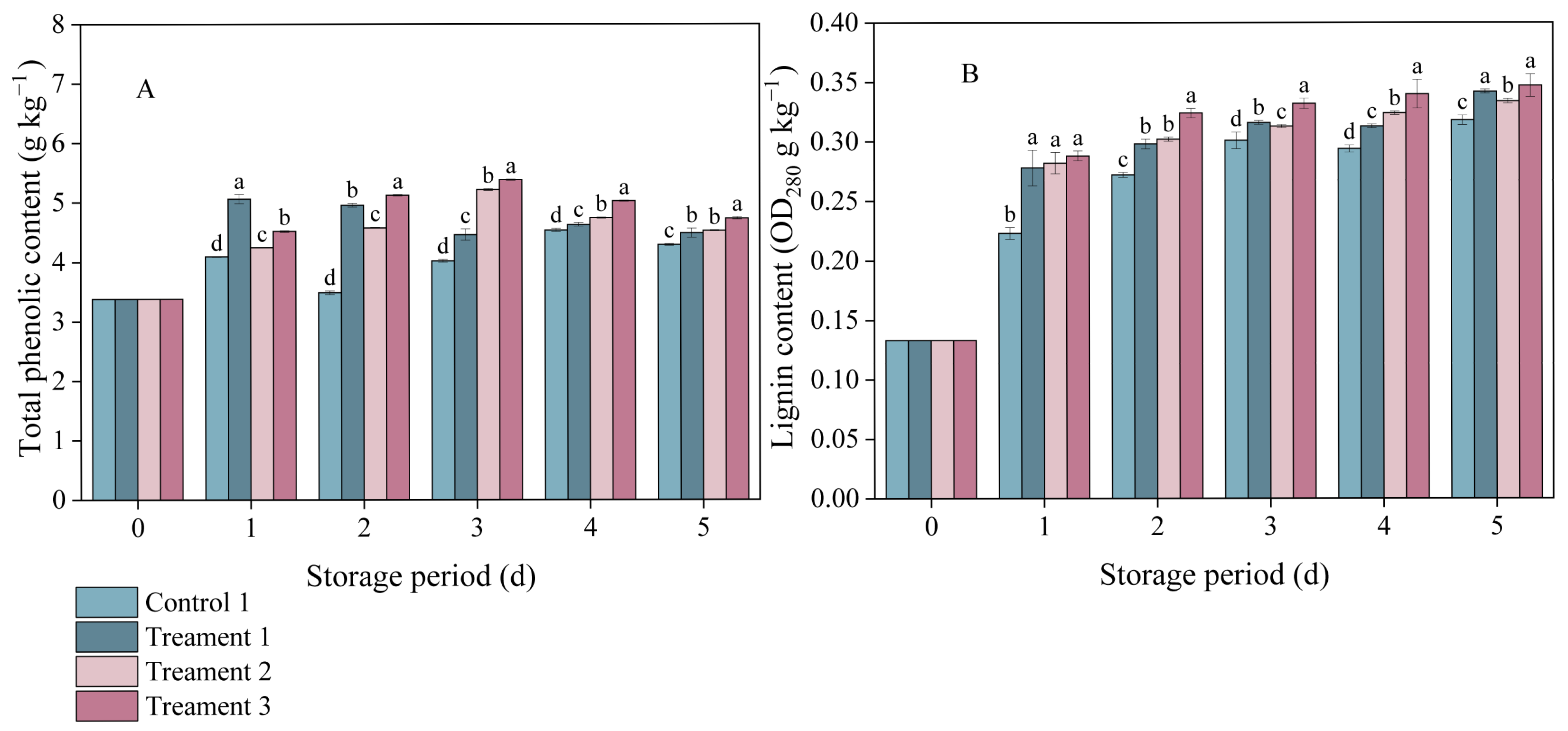 3.3. Effects of Different Treatments on the Total Phenol and Lignin Contents