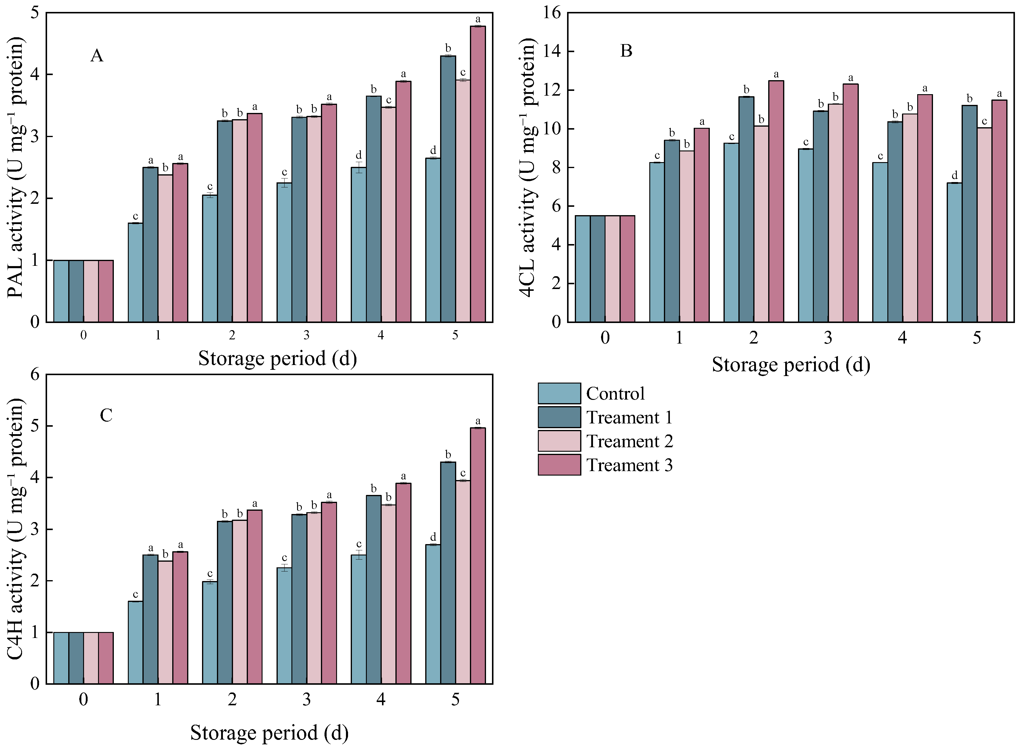 3.4. Effects of Different Treatments on PAL, 4CL, and C4H Activities