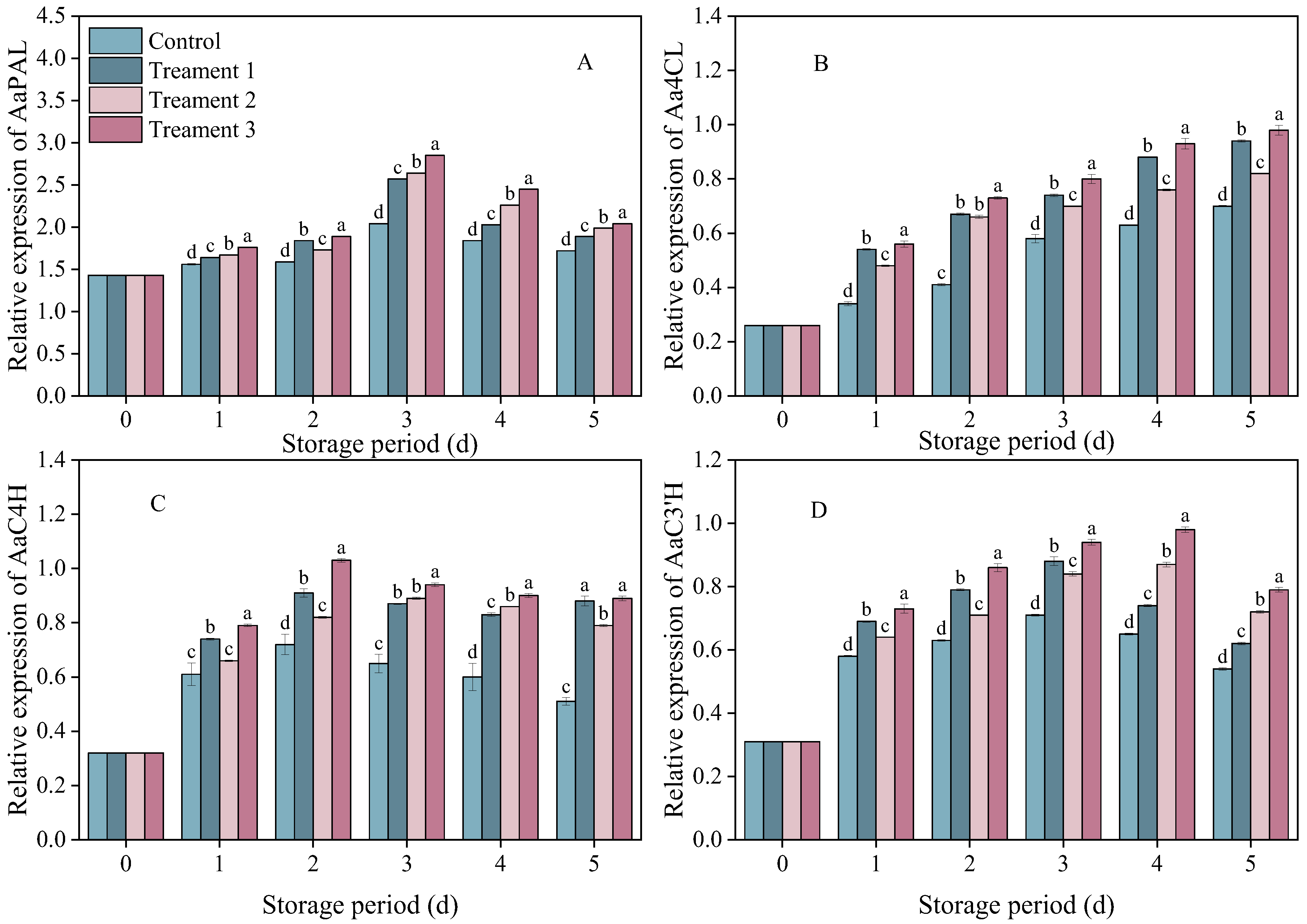 3.5. Effects of Different Treatments on the Expression of Genes Related to Key Enzymes of Phenylpropanoid Metabolism