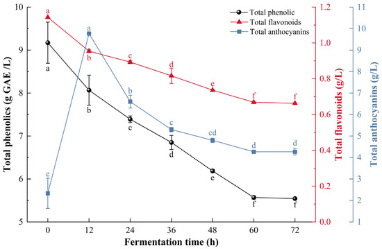 Changes in total phenolics, total flavonoids and total anthocyanins during the fermentation process of composite-strain fermented mulberry beverage. Data are presented as mean ± standard deviation (n = 3). Different letters indicate significant differences (p < 0.05).