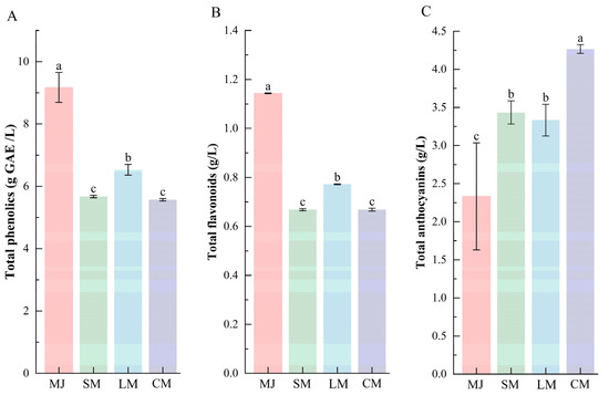 Comparison of total phenolics (A), total flavonoids (B), and total anthocyanins (C) in different types of fermented beverages. Data are presented as mean ± standard deviation (n = 3). Different letters indicate significant differences between (p < 0.05).