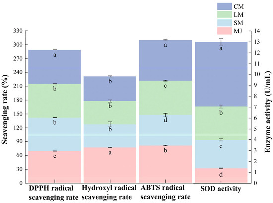 DPPH radical scavenging rate, hydroxyl radical scavenging rate, ABTS radical scavenging rate and SOD activity of different types of mulberry beverages. (DPPH radical scavenging rate, hydroxyl radical scavenging rate, and ABTS radical scavenging rate are plotted on the left vertical axis, while SOD enzyme activity is plotted on the right vertical axis). Data are presented as mean ± standard deviation (n = 3). Different letters indicate significant differences (p < 0.05).
