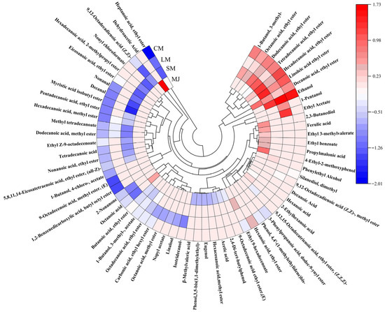 Figure 5 Circular heat map of volatile components detected in mulberry beverages (MJ, SM, LM, and CM). Colors represent the normalized relative abundance of each compound, with red indicating higher abundance and blue indicating lower abundance. Compounds are grouped according to chemical classes, including esters, alcohols, acids, aldehydes, ketones, and phenolic derivatives.