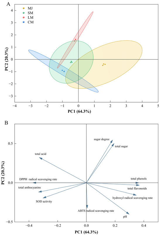 Principal component analysis (PCA) was conducted on various indicators of fermented beverages (Figure 6), including total sugars, sugar content, total acids, pH, total phenols, total flavonoids, total anthocyanins, DPPH radical scavenging rate, hydroxyl radical scavenging rate, ABTS radical scavenging rate, and SOD activity. Two principal components, PC1 and PC2, were extracted, accounting for 64.3% and 20.3% of the total variance in the 11-variable system, respectively. The cumulative contribution rate of these two components reached 84.6%. In the score plot, SM, LM, and CM were positioned on the negative side of PC1, while MJ was located on the positive side of PC1.