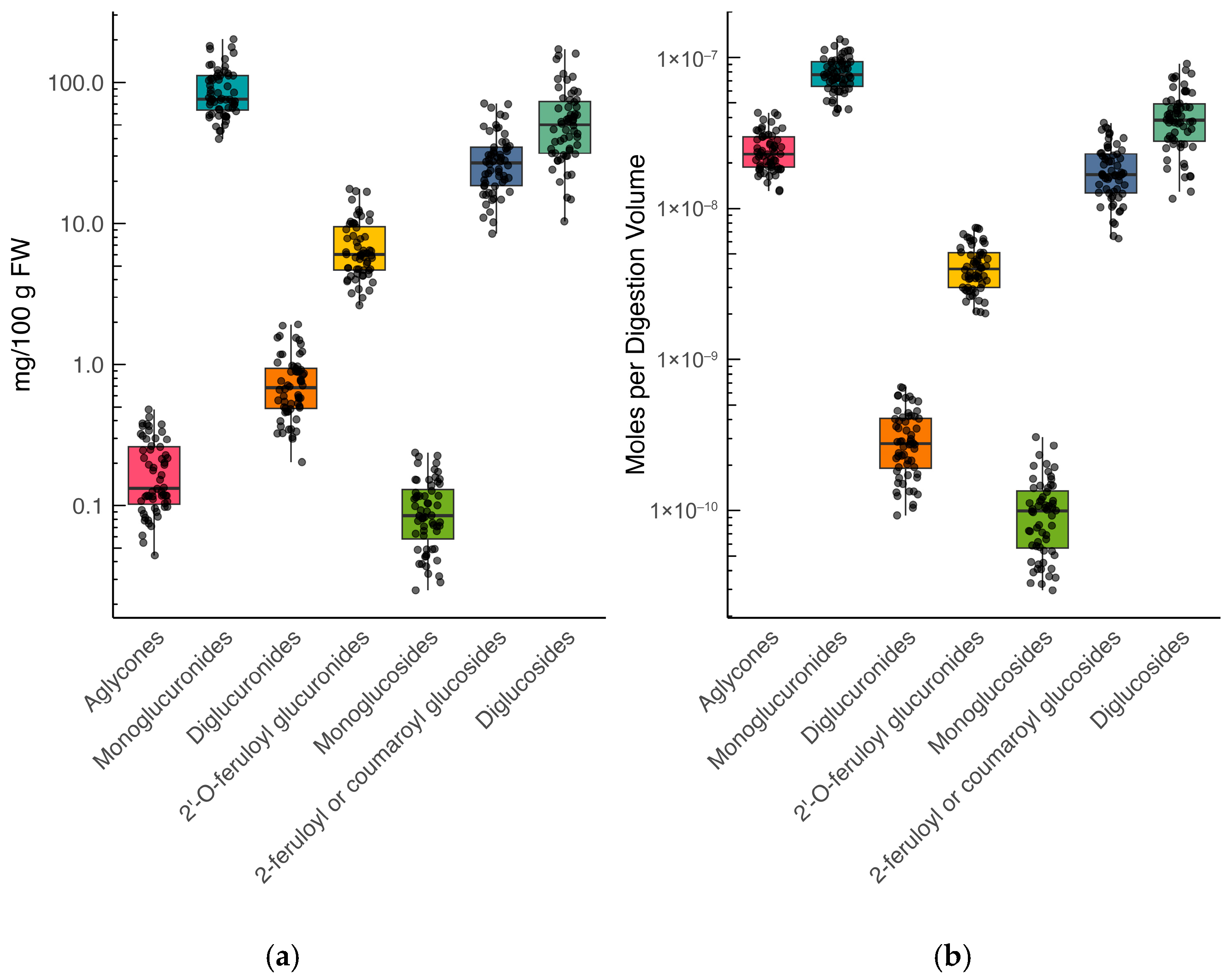 - Williamson, G.; Kay, C.D.; Crozier, A. The Bioavailability, Transport, and Bioactivity of Dietary Flavonoids: A Review from a Historical Perspective. Compr. Rev. Food Sci. Food Saf. 2018, 17, 1054–1112. [Google Scholar] [CrossRef] [PubMed]