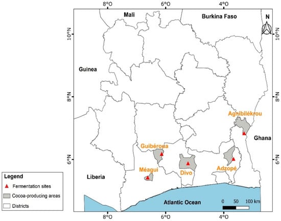 The harvest of ripe cocoa pods and primary cocoa postharvest processing (pod opening, fermentation, and sun-drying) was carried out in 5 main producing areas such as Agnibilekrou (east, geographic coordinates: 7°7′49.012″ N 3°12′11.074″ W), Adzopé (southeast, geographic coordinates: 6°6′25.726″ N 3°51′19.264″ W); Divo (south center, geographic coordinates: 5°49′59.999″ N 5°22′0.001″ W), Guibéroua (west center, geographic coordinates: 6°14′9.805″ N 6°10′16.536″ W), and Méagui (southwest, geographic coordinates: 5°24′00″ N 6°34′00″ O) on both AF and FS system cocoas (Figure 1).