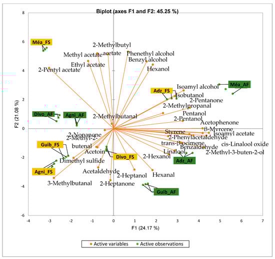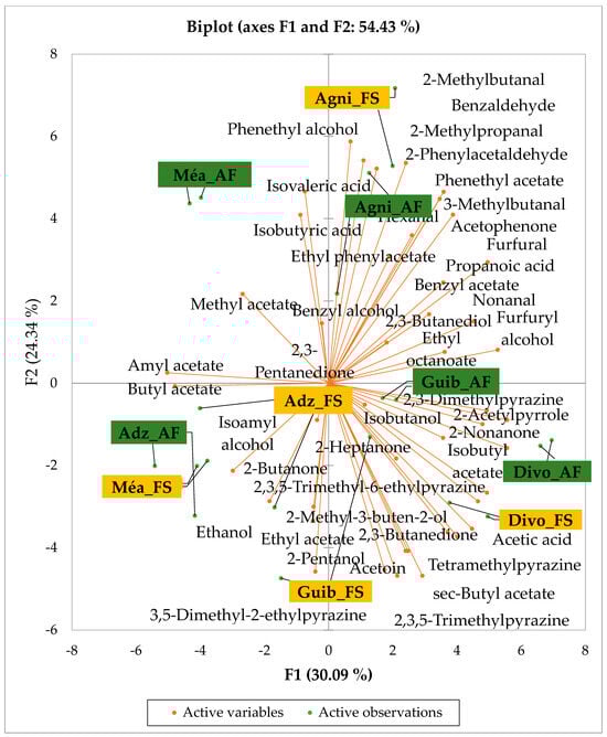 Figure 4 presents the PCA biplot, which reveals the sensory compound profiles of different groups of dry fermented cocoa beans according to the cocoa cultivation system within each cocoa-producing area tested. AF had a significant effect on the sensory profiles of dry fermented cocoa beans from only two cocoa-producing areas, including the Guiberoua and Méagui regions. The volatile compound profiles of cocoa beans from the AF and FS systems sourced from the Adzopé, Agnibilékrou, and Divo regions were similar.
