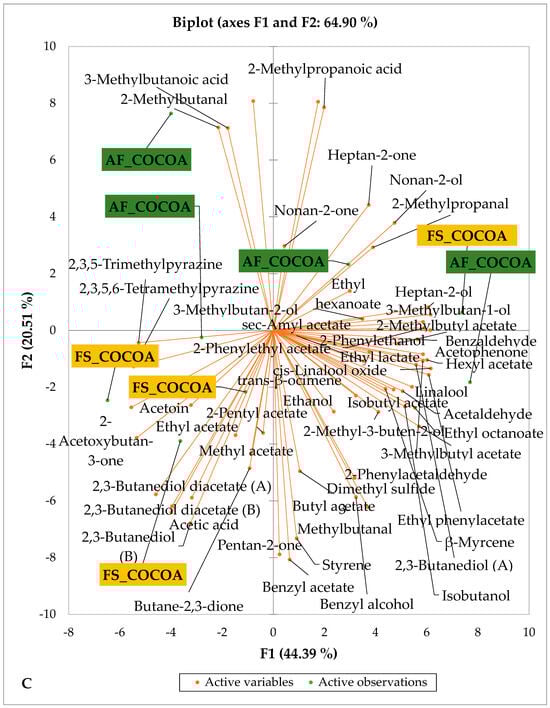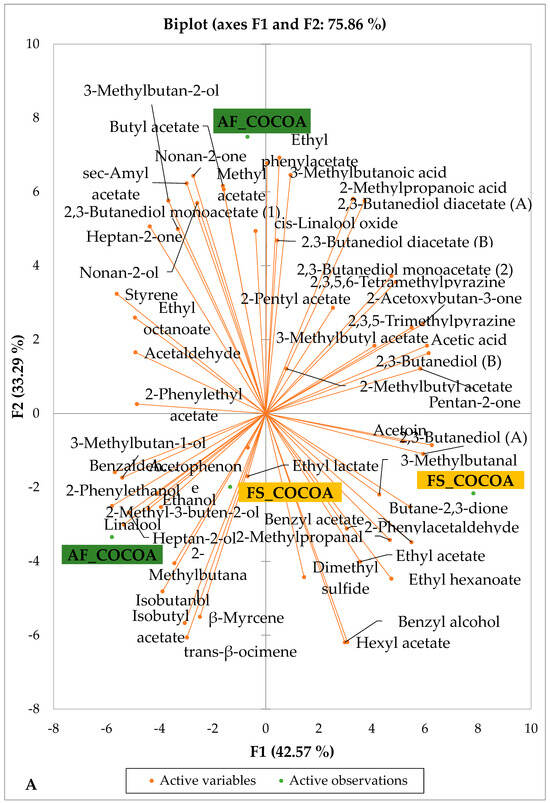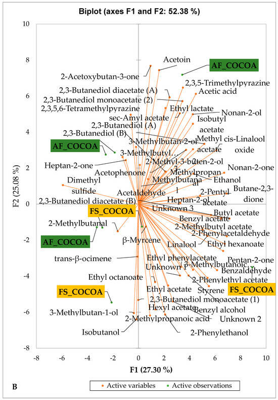 Table 3 shows the concentration of several positive sensory compounds of dry fermented cocoa beans regarding both the AF system and the cocoa-producing regions. A total of 15 useful sensory compounds were found in all of the dry fermented cocoa beans analyzed regardless of the cropping system. The detected desirable sensory attributes belong to various classes such as esters (3-methylbutyl acetate, 2-methylbutyl acetate, benzyl acetate), aldehydes (2-methylpropanal, 2-methylbutanal, 3-methylbutanal), alcohols (benzyl alcohol, 2-phenylethanol, linalool), ketones (acetoin, 2-acetoxybutan-3-one, acetophenone), and pyrazines such as 2,3,5-trimethylpyrazine and tetramethylpyrazine. The fermentation process significantly influences cocoa’s sensory attributes and aroma [54]. Several desirable volatile compounds were detected at the highest concentrations in AF dry fermented cocoa beans from the Guiberoua region. Indeed, 2-methyl butyl acetate, 3-methyl butyl acetate and benzyl acetate were found at 84.2 ± 3.7, 76.3 ± 11.8, and 3.4 ± 2.3 µg.g−1 concentrations respectively. Regarding aldehydes, AF dry fermented cocoa beans recorded 65.32 ± 3.32 µg.g−1 of methyl butanol, while FS cocoa beans recorded 26.3 ± 9.7 µg.g−1. In the class of alcohols, 2-phenylethanol was found at the highest concentrations of 75.4 ± 54.3 and 22.7 ± 8.2 kg.g−1 µg.g−1 in AF and FS cocoa bean samples, respectively. Among pyrazines, tetramethyl pyrazine was found at the highest concentration in dry fermentation produced in the Guiberoua area. The concentration of specific acetate esters including ethyl acetate and phenyl ethyl acetate can be favored by fermentation techniques like turning the beans [55]. The richness of Gubéroua cocoa in various relevant volatile compounds may be due to the sensory attributes produced by yeast species such as Saccharomyces cerevisiae, Pichia kudriazevii and Hanseniaspora opuntia in the fermentation of cocoa carried out in this region [28,56]. Furthermore, Crafack et al. [54] have previously demonstrated that several sensory compounds are produced primarily by yeast and bacteria during the fermentation process, which converts amino acids and higher alcohols into various volatile compound precursors. According to Ho et al. [46] and Ziegleder [57], the volatile compound profile of chocolate is enhanced by significant increases in esters concentration during spontaneous fermentation. The distinct floral and fruity notes that distinguish premium chocolate from bulk varieties are due to other key compounds like linalool (found in fine cocoa varieties) and phenylethyl acetate [12]. Linalool is the essential volatile compound that forms during cocoa fermentation, as Ziegleder [58] has reported for a considerable amount of time. Our finding that tetramethyl pyrazine is the main compound of the pralines class was in accordance with those of previous studies [59]. Although several works reported that the pyrazine group is more common in well-fermented roasted beans, these metabolic products of Bacillus species (B. subtilis or B. megaterium) are formed at the end of cocoa fermentation [40,41,60,61]. Each sensory compound could contribute to the final volatile compound profile of dry fermented cocoa beans. For example, pyrazine compounds have cocoa, chocolate, walnut, popcorn, coconut, candies, and fruity notes [42]. However, certain volatile compounds were more concentrated in AF cocoa beans than those of FS from the Guibéroua region. The impact AF on the formation of crucial volatile compounds in dry-fermented cocoa beans has yet to be shown.
