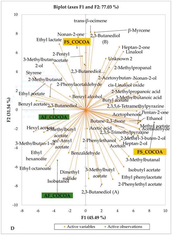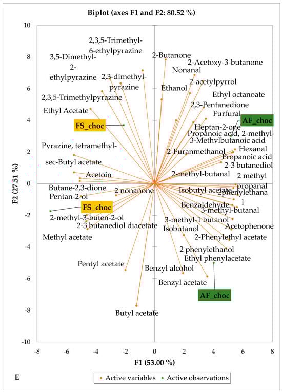PCA biplot of sensory compounds in chocolates produced from dry fermented cocoa beans according to the cropping system within producing regions. The sensory compounds and cropping systems of the cocoa-producing regions in Côte d’Ivoire are indicated on the labels at the bottom of the figure. (AF = agroforestry system; FS = full sun system). (A) Adzopé region; (B) Agnibilékrou region; (C) Divo region; (D) Guibéroua region; (E) Méagui region.