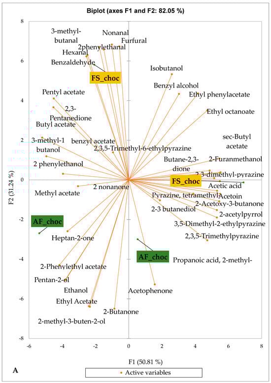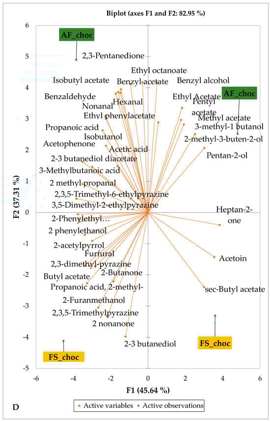 Figure 5 and Figure 6 indicate the PCA biplot, which reveals the effects of AF on the sensory profiles of chocolate both between and within the production areas tested, respectively. The comparison between cocoa-producing areas revealed that the sensory profile of chocolate produced from AF cocoa beans was only distinctive from that of chocolate from FS cocoa beans in the Méagui region. However, our findings about each cocoa-producing area showed that the sensory compound profiles of chocolate derived from AF cocoa beans sourced from the areas of Agnibilékrou (Figure 6B) and Méagui (Figure 6E) were distinctive from those of the chocolate samples derived from FS cocoas within the corresponding areas. AF has shown no significant effect on the sensory profiles of the chocolates issued from other cocoa-producing areas: the Adzopé (Figure 6A), Divo (Figure 6C), and Guiberoua (Figure 6D) regions. The sensory profiles of AF chocolate from the Agnibilékrou region included hexanal, ethyl acetate, ethanol, sec butyl acetate, acetoin and butane-2,3-dione, while those from FS dry fermented cocoa beans included 2,3-butanediol, butyl acetate, 3 methyl butanol, pentan-2-ol, benzyl acetate, ethyl octonate, ethyl phenyl acetate, 3,5 dimethyl-2-ethyl pyrazine, acetophenone, 2-phenyl acetate, and 2,3,5-trimethyl-6-ethyl pyrazine. In the Méagui region, the chocolate derived from AF cocoa beans contained more volatile compounds (23) than those derived from FS cocoa. The sensory profile of this AF chocolate included several key volatile compounds: benzyl alcohol, iso-butanol, benzyl acetate, ethyl phenylacetate, 2-phenyl butanol, benzaldehyde, 2-phenyl ethanol, isobutyl acetate, and 3-methyl butanoic acid. Recall that the sensory profiles of AF dry fermented cocoa beans from Méagui and Agnibilekrou consist of isobutyric and isomeric acids. Isobutyric acid is present in cocoa beans, being formed during the fermentation and drying processes from the decomposition of sugars and other compounds [62]. Although it contributes to the overall sensory profile of the beans, its concentration may vary based on factors such as fermentation time, bean variety, and subsequent processing like roasting [63]. However, isovaleric acid is present in cocoa beans, where it is a volatile organic acid that develops during fermentation. It is produced by microorganisms and contributes to the acidification of the beans, though it is considered an undesirable compound when present in high concentrations, as it can produce a “rancid” smell. The sensory quality of chocolate broadly depends on the volatile compound profile resulting from microbial metabolism during cocoa bean fermentation [64]. The discrimination of the sensory profiles of chocolates derived from AF cocoa beans produced in the Agnibilékrou and Méagui regions could be due to the presence of either one, the other, or even both isovaleric and isobutyric acids.