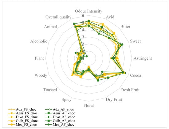 Sixteen descriptive attributes, namely intensity of odor, acid, bitter, sweet, astringent, cocoa aroma, fresh fruit, dried fruit, floral, spicy, toasted, woody, plant, alcoholic aroma, animal, and global quality, were evaluated. The average of the score attributed for each sensory property to the finished chocolates from each fermented cocoa sample was then calculated. Figure 7 and Figure 8A,B show that all end-chocolate samples present the same score for almost all descriptive attributes regardless both of cropping system and geographical origin. Neither AF nor the cocoa production area influenced the sensory perception of the manufactured chocolates.