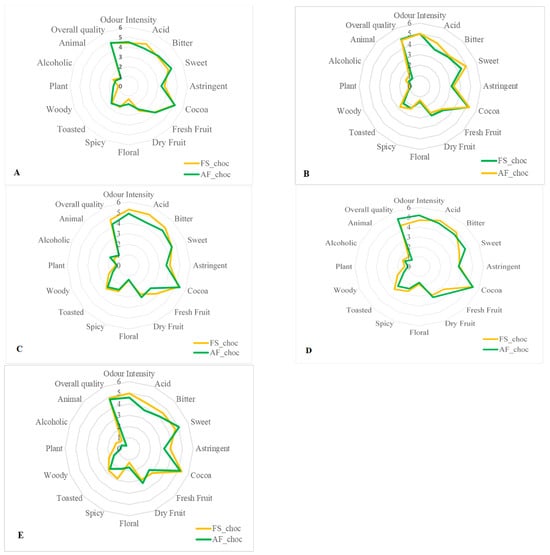 They were asked to smell and taste each AF chocolate sample against the FS chocolate as control made from cocoa beans sourced from the same cocoa-producing region. Two training sessions were held in order to calibrate the panel to the selected sensory traits. The performance of the panel was verified using reference chocolates with known sensory profiles and highly perceivable aromatic notes. Sixteen sensory descriptors were simultaneously evaluated using a scale ranging from 0 to 10, and a total score for global quality was assigned to each chocolate sample.