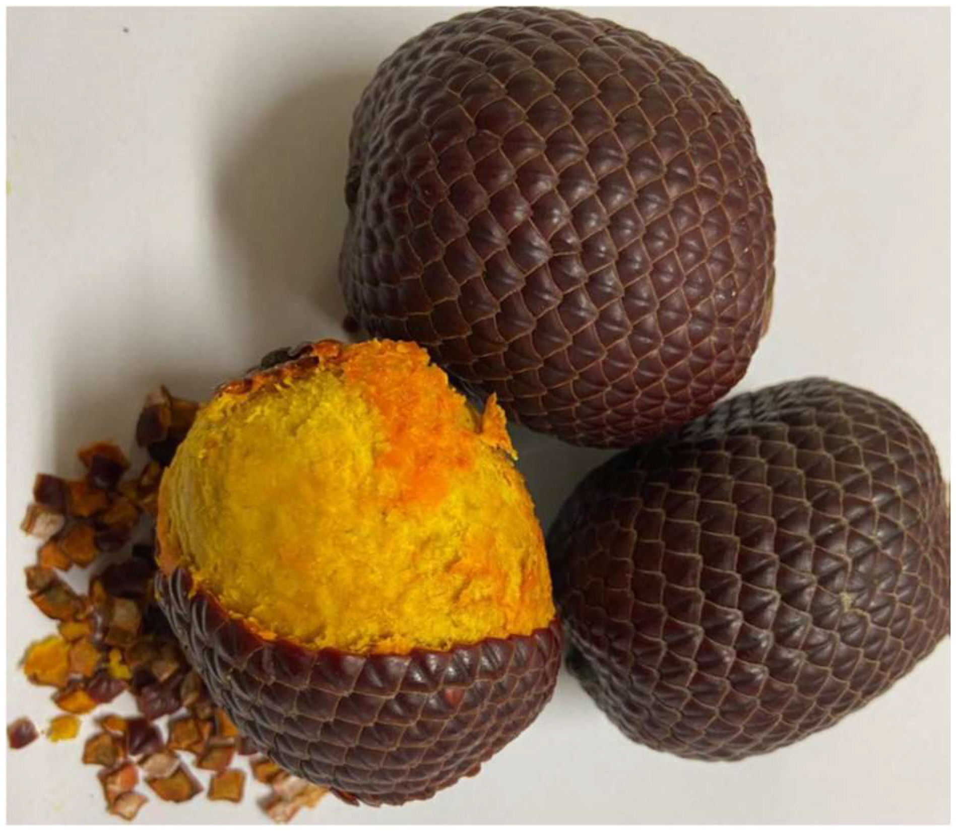 - Souto, R.N.; Pinho, J.d.; Peixe, C.L.; Trindade, M.E.; de Souza, P.G.; da Silva, P.E.; Teixeira-Costa, B.E.; Castelo-Branco, V.N.; Teodoro, A.J. Buriti (Mauritia flexuosa Lf) and Acuri (Attalea phalerata Mart. ex Spreng) oils as functional lipid sources in bakery products: Bioactive composition, sensory evaluation, and technological performance. Foods 2025, 14, 3089. [Google Scholar] [CrossRef]