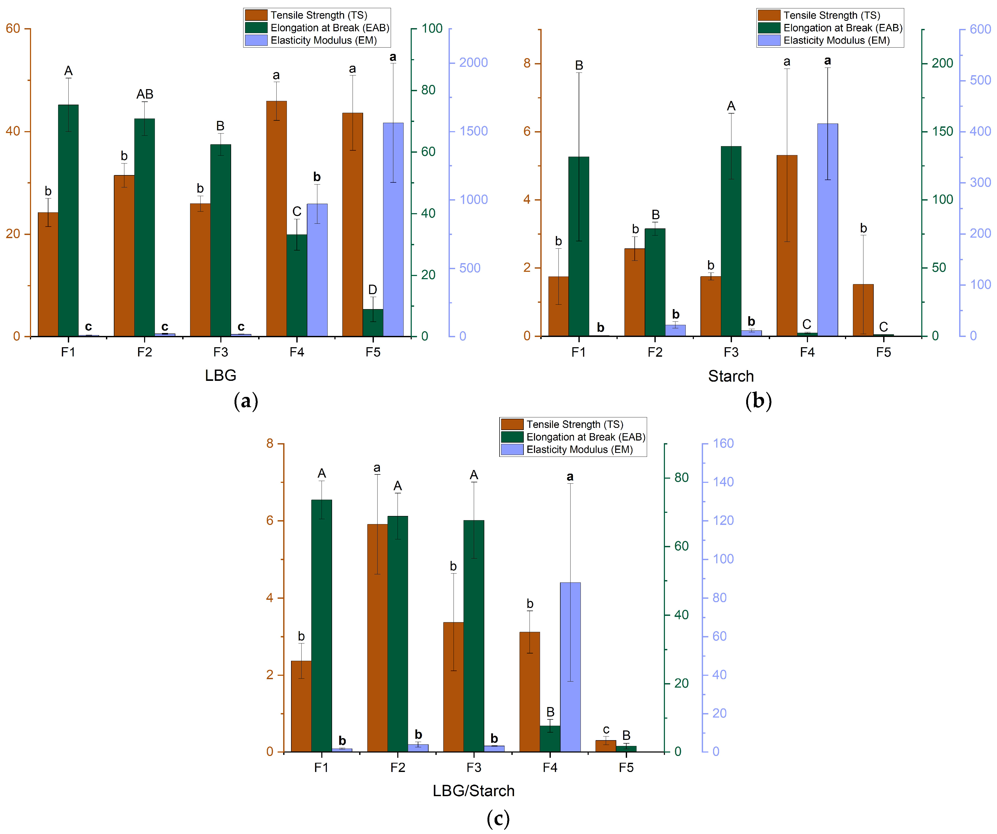 | LBG/Starch | F2 | 27.21 ± 0.33 bc | 5.07 ± 0.22 b | 85.84 ± 3.19 a | 16.266 ± 0.230 b | 0.042 ± 0.006 b |