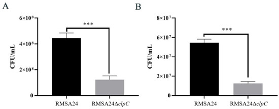 Viable counts of RMSA24 and RMSA24ΔclpC strains before and after drying treatment ((A): 24 h; (B): 48 h). ***, p < 0.001.