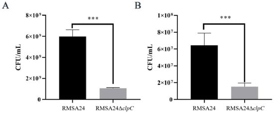 Viable counts of RMSA24 and RMSA24ΔclpC strains before and after high-temperature treatment ((A): 10 min; (B): 30 min). ***, p < 0.001.