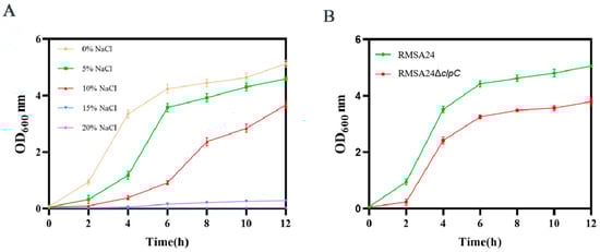 Exponential-phase cultures of WT RMSA24 and RMSA24ΔclpC were inoculated into TSB with different concentration NaCl (0%, 5%, 10%, 15%, and 20%) with an initial OD600 = 0.05 and incubated at 37 °C with shaking (200 rpm). OD600 was recorded every 2 h for 12 h in a microplate reader; three independent wells were measured at each time point [12].