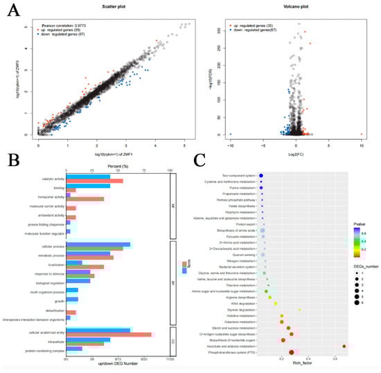 Differentially expressed genes in transcriptome analysis of RMSA24 and RMSA24ΔclpC ((A): visualization scatter plot and volcano plot display; (B): GO secondary annotation diagram; (C): KEGG scatter map).