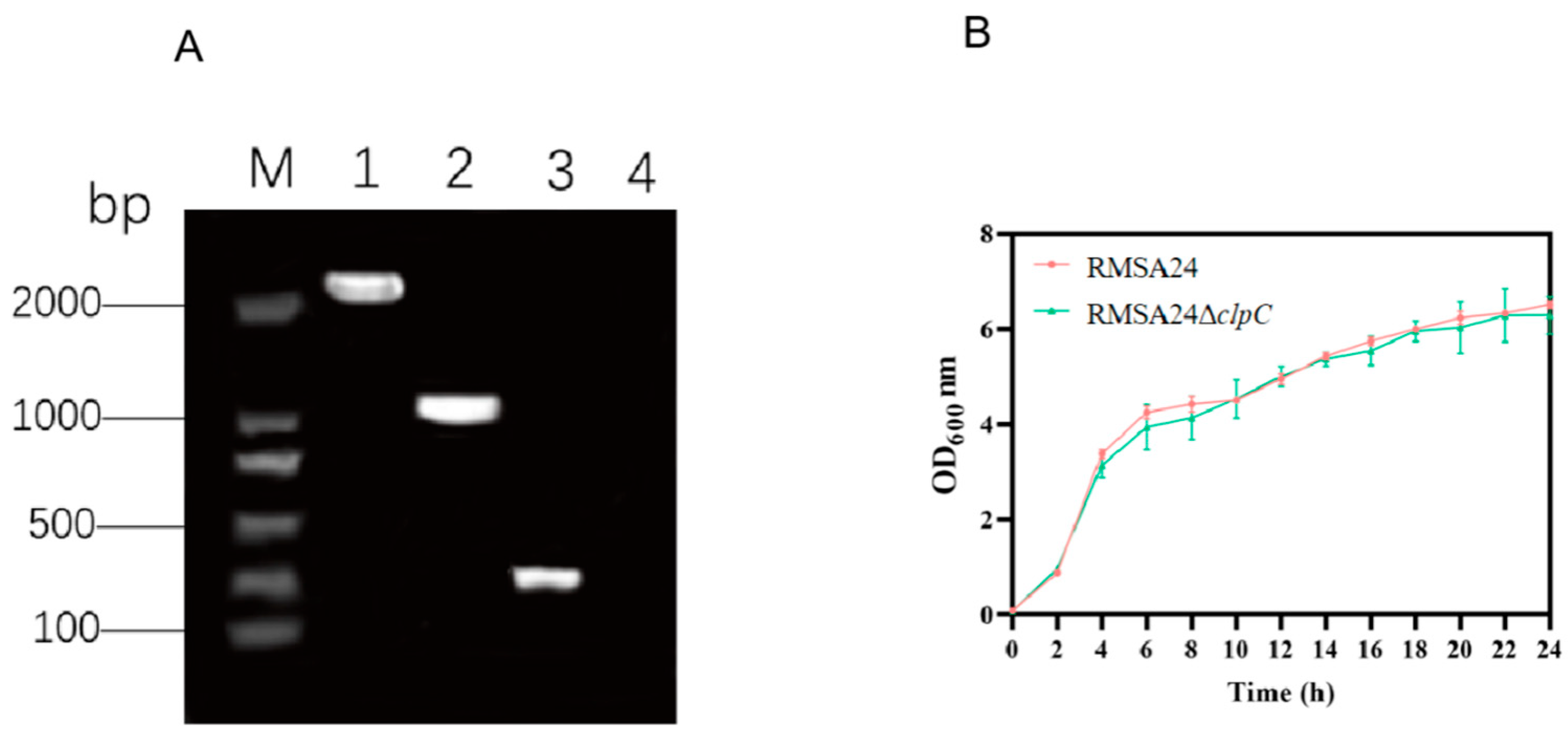 2.2. Construction of the clpC-Deficient Mutant and Growth Curve Analysis